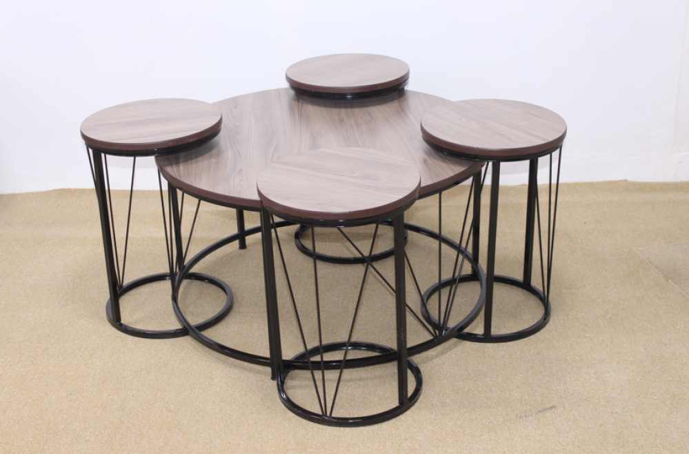 سطح الطاولات مصنوع من الخشب باللون خشبي مع قاعدة حديد لون اسود يضفي لمسة من الأناقة.