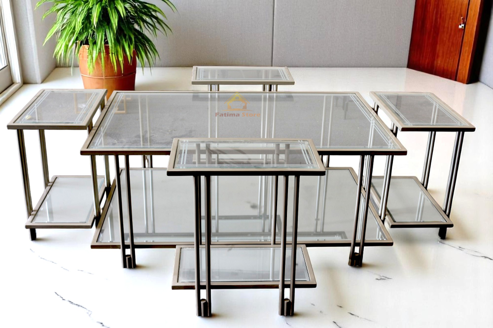 طقم طاولة ضيافة راقي مع 4 خدمه سطح زجاج شفاف قاعدة حديد