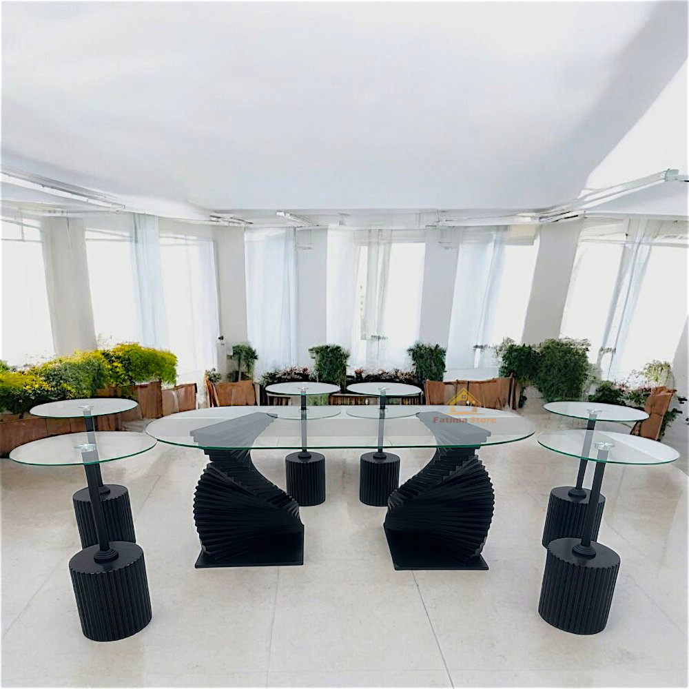 سطح زجاج شفاف أنيق ولمّاع، يضفي فخامة وجمال لا يوصف على المجلس أو غرفة الجلوس الخطوط نظيفة والقواعد تأتي بلون أسود مطفي
