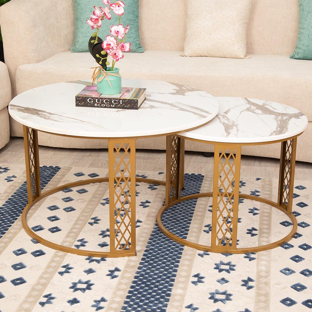 • طقم طاولتين بتصميم عصري وأنيق، يتكون من طاولتين دائريتين بأحجام مختلفة.