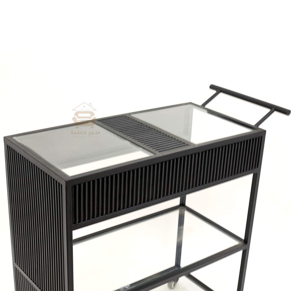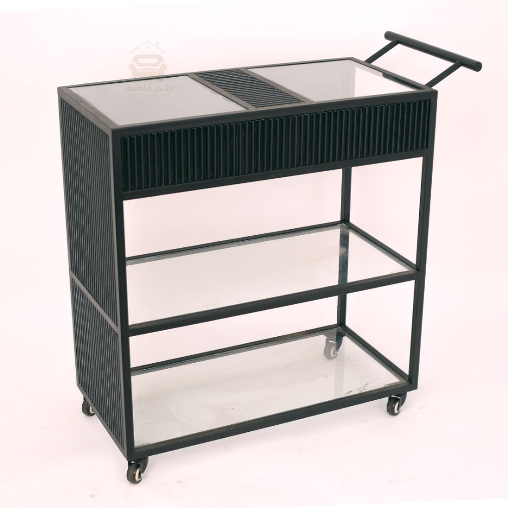 عربة ضيافة ديكور خشب لون اسود قاعدة حديد قص ليزر سطح زجاج