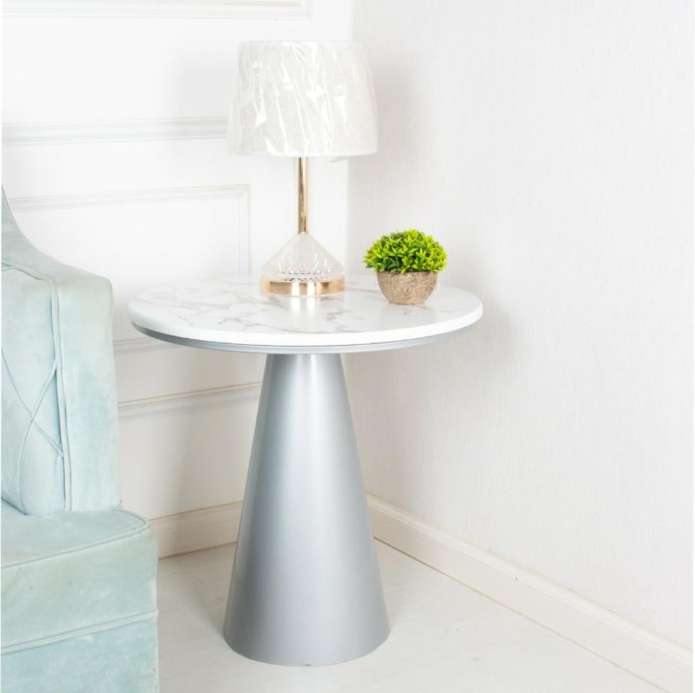 طاولة زاوية جانبية بسطح رخام أبيض وقاعدة لون فضي: