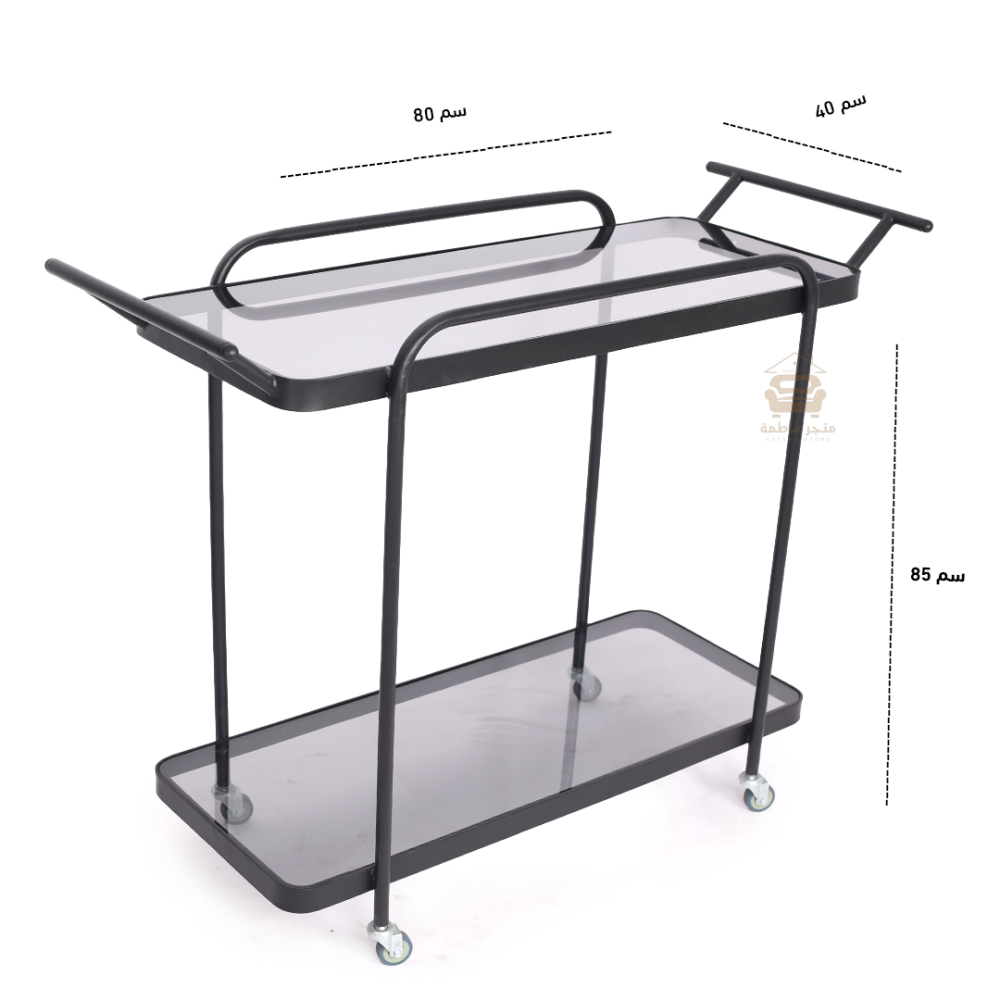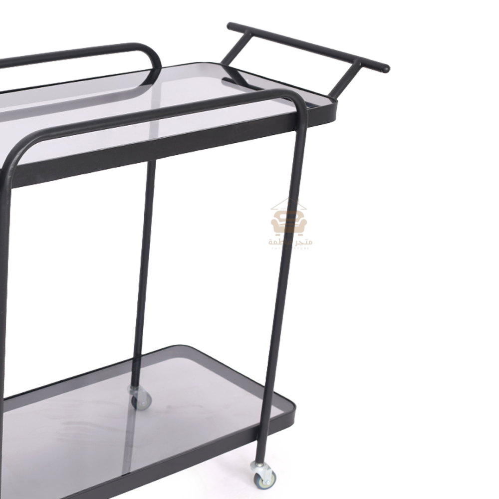عربة تقديم دورين بقواعد حديدية مطفية و سطح زجاجي أسود شفاف مع مسكات طرفية